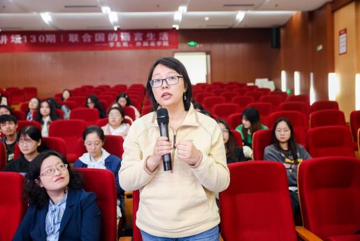 在提问交流环节,现场的师生们围绕联合国内机器翻译的应用现状、国际组织实习渠道等方面积极提问。何勇以前联合国工作人员的视角为老师同学们耐心解惑,现场气氛热烈。