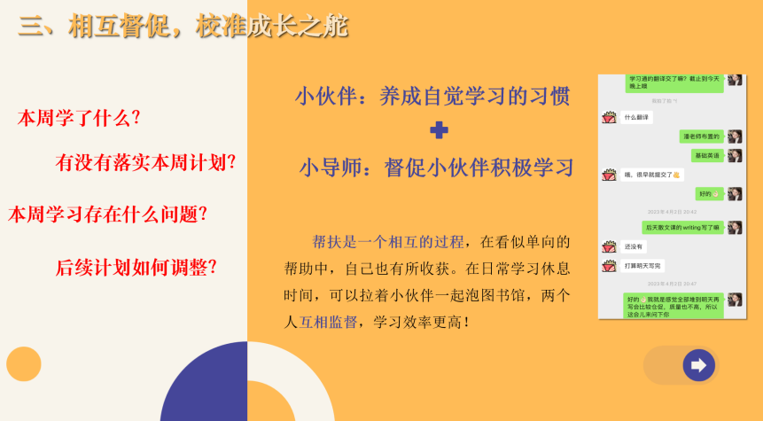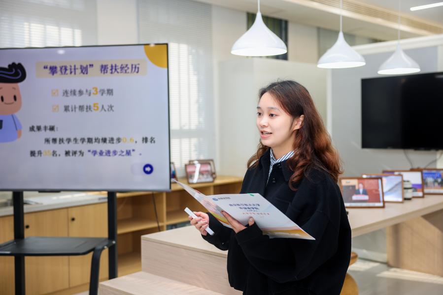 接下来,本科生党员代表叶羽桐分享了自己作为攀登计划朋辈导师的学业帮扶经验。作为年级第一批党员,她带头加入朋辈导师队伍,通过定期单词打卡、每周听力练习和学习复盘等形式,和被帮扶的小伙伴互相监督、相互鼓励,累计帮助5名同学取得了学业上的进步,充分发挥了学生党员的先锋模范作用。她也鼓励更多的学生党员加入学业攀登计划中,持续帮助同学、服务集体,为学风建设贡献力量,以实际行动践行党员的责任与担当。