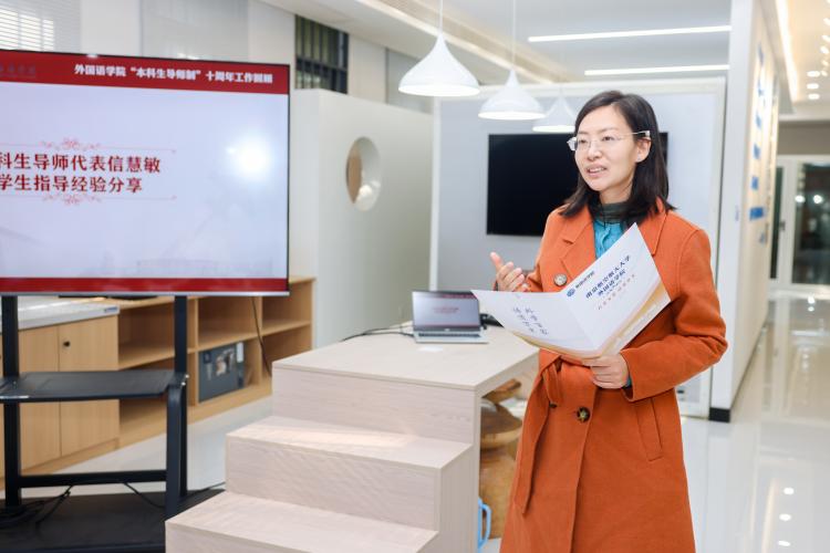本科生导师代表信慧敏分享了自己担任本科生导师十年来指导学生的经验。学院本科生导师制建立伊始,她便主动加入了导师队伍。十年来,她的职业生涯发展也伴随着学院本科生导师制的试行、全面推行以及逐渐完善。她分享了自己与学生建立深厚情感联系、指导学生参与科研项目和学科竞赛以及在教学楼设立图书角努力丰富全校学生人文素养的经验。同时信老师的讲述中也提到了,学院的导师们不仅注重对学生学业的引领,也投入了许多时间和精力为学生提供情感上的呵护与支持。担任本科生导师的十年,同时也是信老师作为专业教师成长的十年。面对学生素质的显著提升和新技术带来的挑战,信老师表示自己和同事们都在积极求新求变,不断更新知识体系,将新技术应用到教学和科研中,希望以自身的学习与提升,鼓励并指导学生们积极学习、不断成长。