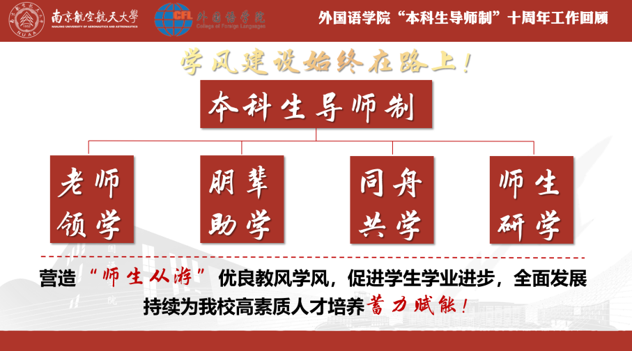 十载耕耘,同心筑梦。学院学风建设的工作成效是全院师生共同努力的阶段性成果。未来,学院将继续以“本科生导师制”为依托,通过“老师领学—朋辈助学—同舟共学—师生研学”的“四维”学风建设工作方法,持续为我校高素质人才培养蓄力赋能!