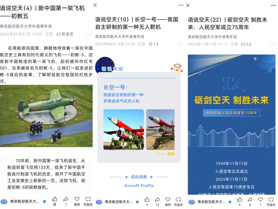围绕学校建设航空航天民航特色鲜明的世界一流大学目标,学院深入挖掘三航故事,宣传三航精神。围绕学校“御风园”航空航天教育基地,推出“译御风园故事”等三航特色专题视频,生动讲述我校三航事业发展的辉煌历程。