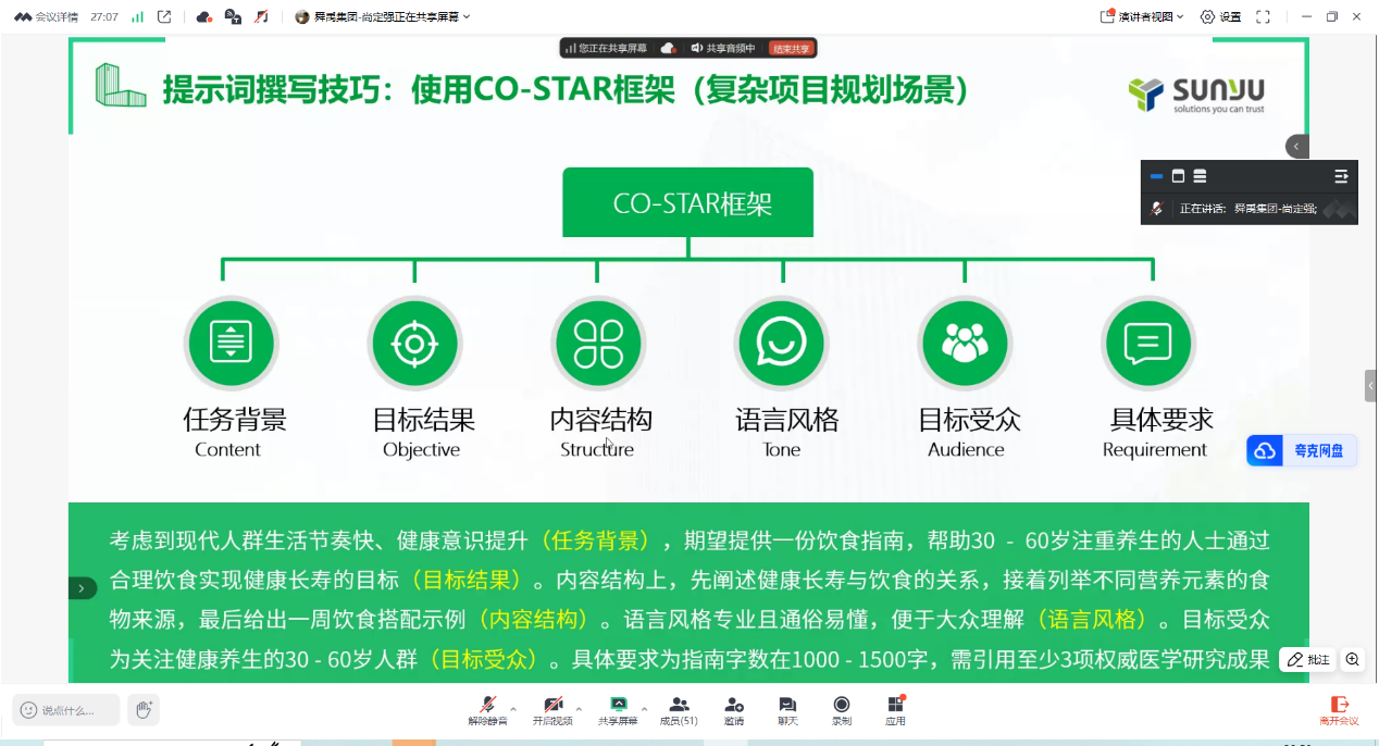 最后,尚定强强调了大模型的重要性。他介绍了提示词撰写技巧,即保持“角色+指令+上下文+输入问题+约束+例子+输出格式”的基本结构和运用CO-STAR等框架,以获得高质量答案。同时演示了提示词模板库以及如何使用Ollama、Docker、FastGPT搭建本地知识库问答系统,介绍了一些AI客户端以及RAG与本地私有知识库;通过强调大模型在笔译中的应用,演示了大模型翻译插件在WORD中的应用。