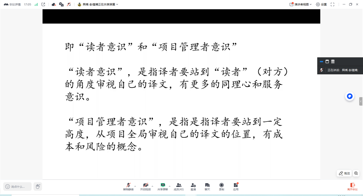 在讲解过程中,彭蕴博强调译者在公示语翻译过程中应具备“两个意识”,即“读者意识”和“项目管理者意识”。“读者意识”是指译者要站到“读者”(对方)的角度审视自己的译文,有更多的同理心和服务意识。“项目管理者意识”指是指译者要站到一定高度,从项目全局审视自己的译文的位置,有成本和风险的概念,强调成本与风险意识,包括法律风险、政治风险、舆论风险、质量风险等。