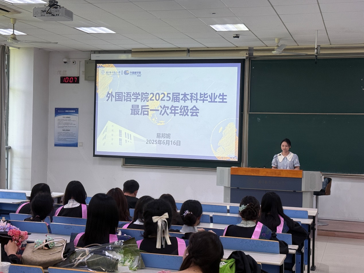 6月16日,2021级本科毕业生齐聚一堂,辅导员易邦妮主持召开了最后一次年级会。易邦妮以校训“智周万物,道济天下”勉励外语学子勇担时代使命,并开展毕业前安全教育,为即将启程的青春保驾护航。