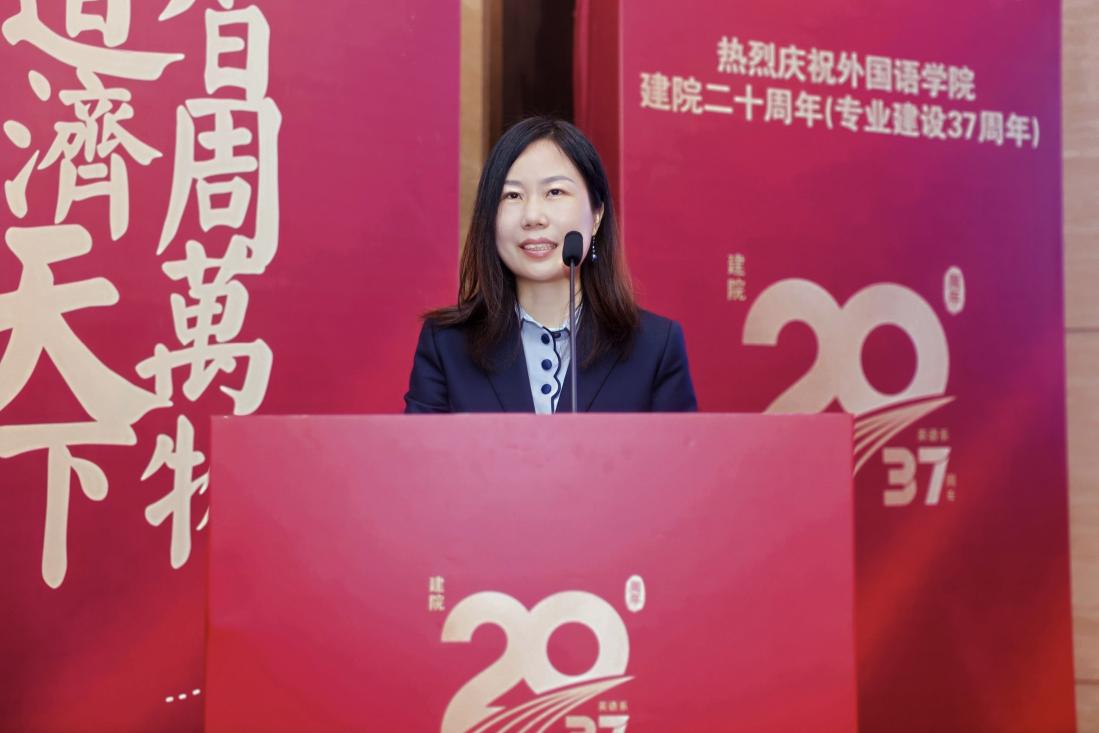 2006届本科毕业生2009届硕士毕业生,北京航空航天大学出版社副总经理、副总编辑葛建平在发言中深情回顾了她在南航两校区七年的求学时光,她表示,将军路的现代与活力,教会我们用开放的姿态拥抱全球视野;明故宫的厚重与沉静,提醒我们用严谨的态度钻研语言本质。谈及如今从事高等教育和学术出版工作的感悟,强调外语已成为连接中外的纽带、文化传承的载体以及讲好中国故事、提升国际话语权的重要力量,并祝福学院继续以语言为桥、以文化为帆,在未来培养更多国家需要的复合型外语人才,孕育更多学术硕果。