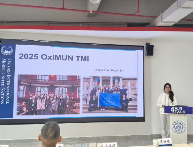 接下来,牛津模联团队成员依次分享了参与此项赛事的收获与感悟。刘星星与冯熠晗解析了模联的基本框架与规则,并对比新加坡与牛津模联的异同,拓宽了大家对模联的多维认知。陆欣妍聚焦会前准备与现场发挥,结合实战经验,分享了应对挑战的具体方法与高效备赛技巧。荣获“最佳立场文件”的石宇琳,基于获奖体会,独家讲解了优秀立场文件的写作要领与精准传达立场的方法。来自工科背景的冯柯涵与江君,则从跨学科视角出发,分享如何以工科思维应对全球议题,并鼓励大家以多元视角进行学习与探索。