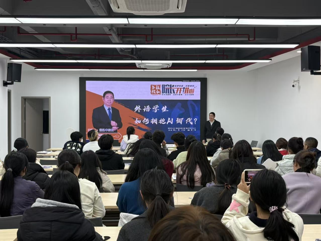 讲座最后,徐以中寄语全体在座学子:置身于AI时代,外语人才应主动拥抱技术变革,拓宽“语言+”复合发展路径,在对外交流传播、人机交互、教育、翻译等领域探索新定位,成为兼具语言能力、技术素养与人文精神的未来引领者。